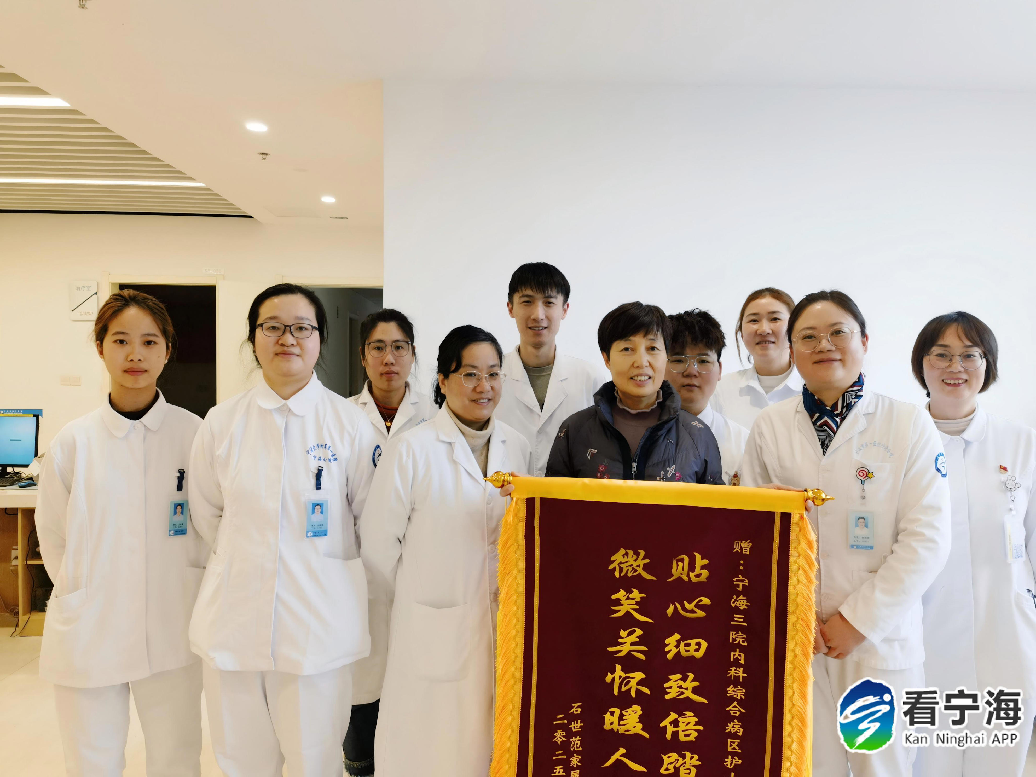 1月22日上午,一位患者家属向宁海县第三医院(宁波大学附属第一医院宁海分院)内科综合病区护士组赠送了一面题有“贴心细致倍踏实,微笑关怀暖人心”的锦旗,以此向内科综合病区护士组长期以来的精心治疗和用心护理表示诚挚地感谢。